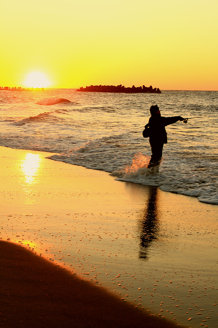 冬の日、夜明けの海に出掛けました。昇る朝日、金色に染まる美しい空と海を背景に気合いのこもった一投を投じる釣り人と出会いました。