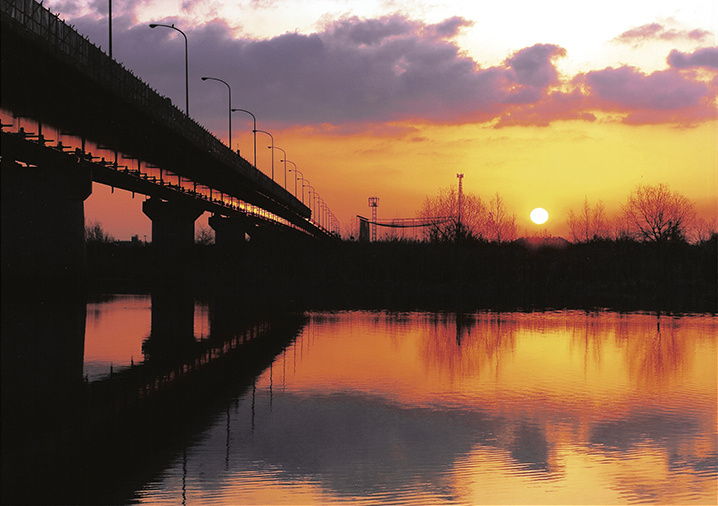 寒い冬の朝、鉄橋を走る時間と朝日が顔を出す時間が合わさるのをじっと待ち、あわててシャッターを押しました。
